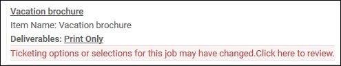 ● If you are re-ordering a product, it is always a good idea to review the job details (if you are allowed to do so) before placing the order. Sometimes a message in the cart informs you that ticketing (print) options or content files changed since you last ordered the product. Depending on the product, you may be able to click a link to review the job, its contents, and its print options.